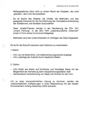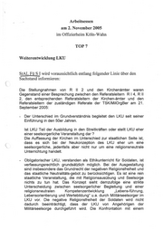 Arbeitsessen am 02. November 2005 TOP 7 Weiterentwicklung LKU Vortrag: SSALFüSI Ziel: Information über den Sachstand Dieser TOP ist von Fü S I eingebracht worden. Sachstand: 1. Das Konzept des Fü S zur Neugestaltung des LKU (Stand: 14. Juli 2005 / Anlage 1) berücksichtigt im Wesentlichen die Konzeption des EKA/KMBA vom 16. Dezember 2004 (Anlage 2) mit Ergänzung vom 27. Juli 2005 (Anlage 3). Die mit e-mail Fü S I 3 vom 29. August 2005 (Anlage 4) übermittelte weitere Stellungnahme des EKA/KMBA hat keinen nennenswerten Einfluss auf die Beurteilung der Sachlage. . Die verfassungsrechtliche Bewertung der neuen Konzeption des LKU, die ergebnisorientiert Konsequenzen und Lösungsmöglichkeiten aufzeigt (R II 2 vom 29. August 2005 / Anlage 5), war Gegenstand der Besprechung am 21.09.2005 (auf Einladung Fü S 13). . Offen ist noch die mit Schreiben R I 4 vom 09. Mai 2005 (Anlage 6) aufgeworfene Frage nach der zeitlichen Beanspruchung der Militärgeistlichen durch Erteilung des LKU. Sprechempfehlung: Wir treten für eine Trennung zwischen LKU und Ethikunterricht ein. Ein neuer, einheitlicher Unterricht müßte auf den rechtlichen Prüfstand. Der LKU-Anteil würde dabei durchfallen. Schon jetzt hängt der LKU an einem dünnen verfassungsrechtlichen Faden. Wäre er „verpflichtend für alle“ und „unter staatlicher Aufsicht“, könnte er nicht mehr gehalten werden.