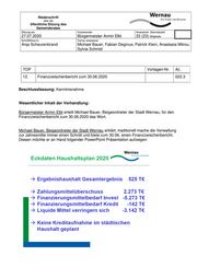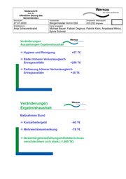 Niederschrift über die öffentliche Sitzung des Gemeinderates Sitzung am Vorsitzender Anwesend (Normalzahl) 27.07.2020 Bürgermeister Armin Elbl 22 (23) Mitglieder Schriftführer/in Ferner anwesend Anja Scheurenbrand Michael Bauer; Fabian Deginus; Patrick Klein; Anastasia Mitrou; Sylvia Schmid Michael Bauer, Beigeordneter der Stadt Wernau erklärt, der Finanzzwischenbericht zeige ein Gesamtergebnis von 525.000 Euro im Ergebnishaushalt. Die liquiden Mittel würden abschmelzen, dennoch sei keine Kreditaufnahme im städtischen Haushalt für dieses Jahr geplant. Zu den Veränderungen erklärt er, die Gewerbesteuer sei immer noch im Planungsansatz. Er könne jedoch nicht versprechen, dass dies so bleibe. Bei der Grundsteuer sei ein kleiner Rückgang zu verzeichnen. Bei der Einkommenssteuer liege die Steuerschätzung Mai bei über einer Mio. Euro weniger. Man verzeichne einen Rückgang bei der Umsatzsteuer sowie bei der Vergnügungssteuer. Zur positiven Entwicklung zähle die Zuwendung vom Land in Höhe von 166.000 Euro. Die Schlüsselzuweisungen seien so wie geplant, plus minus Null. Die negative Entwicklung sei der Verzicht auf die Erhebung der Betreuungsentgelte in Höhe von -283.000 Euro, Ausfälle im Tagungszentrum in Höhe von -31.000 Euro sowie der Pachterlass der Gastronomie sbr in Höhe von -8.000 Euro, Ertragsausfälle Theater - 45.000 Euro. Ausgaben für Hygienemaßnahmen würden mit 57.000 Euro zu Buche schlagen und ein Verlustausgleich Erträge im Bereich Bäder in Höhe von 258.000 Euro. Es gebe einen Ver- lustausgleich Erträge für die Parkierung in Höhe von 35.000 Euro. Fazit sei, das Gesamtergebnis/ der Zahlungsmittelüberschuss verschlechtere sich stark: - 1.460.000 Euro. Bei den Investitionen gebe es Einsparungen bei nicht vorgenommenen Investitionen im geplanten Sportpark Neckartal. Das Ergebnis 2019 verspreche deutliche Mehreinnahmen, die so nicht eingeplant waren, sodass damit das Jahr 2020 abgefedert werden könne.