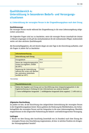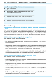 QPR – VOLLSTATIONÄRE PFLEGE – ANLAGE 1: PRÜFBOGEN A – PERSONENENBEZOGENE VERSORGUNG 2. Bei Langzeitpflege: Leistete die Einrichtung in den ersten Wochen nach dem Einzug zielgerichtete Unterstützung? 3. Bei Kurzzeitpflege: Leistete die Einrichtung in den ersten Tagen nach der Aufnahme zielgerichtete Unterstützung? Bewertung der Auffälligkeiten und Defizite A keine Auffälligkeiten B Auffälligkeiten, die keine Risiken oder negativen Folgen für die versorgte Person erwarten lassen C Defizit mit Risiko negativer Folgen für die versorgte Person D Defizit mit eingetretenen negativen Folgen für die versorgte Person Hinweise zur Bewertung B) Auffälligkeiten, die keine Risiken oder negativen Folgen für die versorgte Person erwarten lassen Diese Bewertung trifft zu, wenn die Dokumentation des Verlaufs der Eingewöhnungsphase und der geleisteten Hilfen lückenhaft ist, eine bedarfsgerechte Unterstützung der versorgten Person aber dennoch nachvollziehbar geleistet wurde. C) Defizit mit Risiko negativer Folgen für die versorgte Person Diese Bewertung trifft zu, wenn beispielsweise – Informationen zu einem Versorgungsbedarf, der sofortige Reaktionen erforderlich macht, nicht spätestens innerhalb von 24 Stunden nach dem Einzug erfasst wurden (z. B. Medikation, Verhaltensweisen mit Selbst- oder Fremdgefährdungspotenzial, problematischer Hautzu- stand). – ein Integrationsgespräch zwar stattfand, die Ergebnisse aber nicht verschriftlicht wurden. – die Maßnahmenplanung die Unterstützung des Einlebens nicht berücksichtigte. D) Defizit mit eingetretenen negativen Folgen für die versorgte Person Diese Bewertung trifft zu, wenn beispielsweise – nicht erkennbar ist, dass eine zielgerichtete Unterstützung zum Einleben überhaupt umgesetzt wurde. – die Unterstützung zum Einleben sich auf das Integrationsgespräch beschränkte, wenngleich ein weitergehender Unterstützungsbedarf gegeben war.