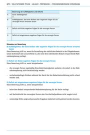 QPR – VOLLSTATIONÄRE PFLEGE – ANLAGE 1: PRÜFBOGEN A – PERSONENENBEZOGENE VERSORGUNG Bewertung der Auffälligkeiten und Defizite A keine Auffälligkeiten B Auffälligkeiten, die keine Risiken oder negativen Folgen für die versorgte Person erwarten lassen C Defizit mit Risiko negativer Folgen für die versorgte Person D Defizit mit eingetretenen negativen Folgen für die versorgte Person Hinweise zur Bewertung B) Auffälligkeiten, die keine Risiken oder negativen Folgen für die versorgte Person erwarten lassen Diese Bewertung trifft zu, wenn sich beispielsweise keine oder nur lückenhafte Hinweise auf die Ermittlung der relevanten Bedürfnisse der versorgten Person in der Pflegedokumentation finden lassen, aber aufgrund anderer Informationen nachvollzogen werden kann, dass die Bedürf- nisse der versorgten Person bekannt sind und sich die Tagesstrukturierung daran ausrichtet. C) Defizit mit Risiko negativer Folgen für die versorgte Person Diese Bewertung trifft zu, wenn beispielsweise – eine Tagesstrukturierung existiert, aber nicht schriftlich fixiert wurde (z. B. nur mündlich kommuniziert wird). – nicht erkennbar ist, dass reflektiert oder praktisch überprüft wurde, ob durch eine Anpassung der Tagesstrukturierung emotionale Belastungen oder Verhaltensweisen der versorgten Person positiv beeinflusst werden können (falls ein entsprechender Bedarf besteht). – die Bedürfnisse der versorgten Person nicht bekannt sind, weil die Einrichtung die im Einzel- fall bestehenden Möglichkeiten zur Erfassung der Bedürfnisse nicht ausgeschöpft hat. D) Defizit mit eingetretenen negativen Folgen für die versorgte Person Diese Bewertung trifft zu, wenn beispielsweise – keine Tagesstrukturierung existiert, obwohl die versorgte Person den Tag nicht selbstständig planen und ihre Planung umsetzen kann. – keine Unterstützung der versorgten Person erfolgt, den Alltag gemäß der definierten Tages- strukturierung zu gestalten. – die vorliegende Tagesstrukturierung keinen Bezug zu den Bedürfnissen der versorgten Person aufweist. – für die versorgte Person keine geeigneten, ihren Bedürfnissen und gesundheitlichen Beein- trächtigungen entsprechenden Beschäftigungsangebote existieren.