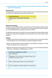 56 | 57 4.3 Unterstützung von versorgten Personen mit herausfordernd erlebtem Verhalten und psychischen Problemlagen Qualitätsaussage Versorgte Personen mit herausfordernd erlebtem Verhalten erhalten eine ihren Verhaltensweisen und psychischen Problemlagen entsprechende Unterstützung. Informationserfassung Verhaltensweisen und psychische Problemlagen: (Freitext) Allgemeine Beschreibung Zu prüfen ist hier die Unterstützung der versorgten Person mit herausfordernd erlebtem Verhal- ten, die darauf abzielt, Risiken zu vermeiden, das herausfordernd erlebte Verhalten einzugren- zen und das Wohlbefinden der versorgten Person aktiv zu fördern. Die folgenden Fragen sind nur zu bearbeiten, wenn die versorgte Person herausfordernd erlebtes Verhalten oder psychische Problemlagen zeigt. Anderenfalls weiter mit dem nächsten Quali- tätsaspekt. Leitfragen 1. Erfolgten eine Erfassung der Verhaltensweisen der versorgten Person und eine darauf aufbau- ende Einschätzung, ob aus dem Verhalten ein Unterstützungsbedarf erwächst? 2. Wurden verhaltenswirksame Faktoren identifiziert und Maßnahmen eingeleitet, um diese Faktoren zu begrenzen oder zu kompensieren? 3. Erhält die versorgte Person eine geeignete Unterstützung, um trotz der Verhaltensproblematik Bedürfnisse zu befriedigen und Wohlbefinden zu erleben? Bewertung der Auffälligkeiten und Defizite A keine Auffälligkeiten B Auffälligkeiten, die keine Risiken oder negativen Folgen für die versorgte Person erwarten lassen C Defizit mit Risiko negativer Folgen für die versorgte Person D Defizit mit eingetretenen negativen Folgen für die versorgte Person