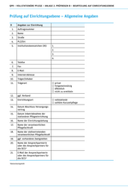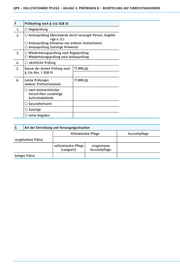 QPR – VOLLSTATIONÄRE PFLEGE – ANLAGE 2: PRÜFBOGEN B – BEURTEILUNG AUF EINRICHTUNGSEBENE F Prüfauftrag nach § 114 SGB XI 1. Regelprüfung 2. Anlassprüfung (Beschwerde durch versorgte Person, Angehö- rige o. ä.) Anlassprüfung (Hinweise von anderen Institutionen) Anlassprüfung (sonstige Hinweise) 3. Wiederholungsprüfung nach Regelprüfung Wiederholungsprüfung nach Anlassprüfung 4. nächtliche Prüfung 5. Datum der letzten Prüfung nach TT.MM.JJJJ § 114 Abs. 1 SGB XI 6. Letzte Prüfungen TT.MM.JJJJ anderer Prüfinstitutionen n ach heimrechtlichen Vorschriften zuständige Aufsichtsbehörde Gesundheitsamt Sonstige keine Angaben G Art der Einrichtung und Versorgungssituation Vollstationäre Pflege Kurzzeitpflege vorgehaltene Plätze vollstationäre Pflege eingestreute (Langzeit): Kurzzeitpflege: belegte Plätze