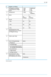 62 | 63 E Angaben zur Prüfung 1. Auftraggeber/zuständiger AOK KNAPPSCHAFT Landesverband der Pflege- BKK LKK kassen IKK vdek 2. Prüfung durch MDK P KV- Prüfdienst 3. Datum von bis TT.MM.JJJJ TT.MM.JJJJ 4. Uhrzeit 1. Tag von bis 2. Tag von bis 3. Tag von bis 5. Gesprächspartnerin oder Gesprächspartner der stationä- ren Pflegeeinrichtung 6. Prüferin oder Prüfer 7. An der Prüfung Beteiligte Namen Pflegekasse Sozialhilfeträger n ach heimrechlichen Vorschrif- ten zuständige Aufsichtsbehörde Gesundheitsamt Trägerverband Sonstige: welche? 8. Ansprechpartnerin oder Name Ansprechpartner des MDK/ PKV-Prüfdienstes für die DCS* E-Mailadresse *Datenclearingstelle