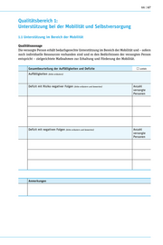 66 | 67 Qualitätsbereich 1: Unterstützung bei der Mobilität und Selbstversorgung 1.1 Unterstützung im Bereich der Mobilität Qualitätsaussage Die versorgte Person erhält bedarfsgerechte Unterstützung im Bereich der Mobilität und – sofern noch individuelle Ressourcen vorhanden sind und es den Bedürfnissen der versorgten Person entspricht – zielgerichtete Maßnahmen zur Erhaltung und Förderung der Mobilität. Gesamtbeurteilung der Auffälligkeiten und Defizite entfällt Auffälligkeiten (bitte erläutern) Defizit mit Risiko negativer Folgen (bitte erläutern und bewerten) Anzahl versorgte Personen Defizit mit negativen Folgen (bitte erläutern und bewerten) Anzahl versorgte Personen Anmerkungen