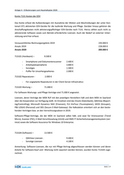 Anlage 4 – Erläuterungen zum Haushaltsplan 2020 Konto 7131 Kosten der EDV Das Konto erfasst die Aufwendungen mit Ausnahme der Mieten und Abschreibungen der unter Kon- tenart 071 aktivierten EDV-Geräte für die laufende Wartung und Pflege. Darüber hinaus gehören die Anschaffungskosten nicht aktivierungspflichtiger EDV-Geräte nach 7131. Hierzu zählen auch nicht zu aktivierende Software sowie zum Betrieb erforderliche Lizenzen. Auch der Bedarf an externer Unter- stützung wird hier erfasst. Voraussichtliches Rechnungsergebnis 2019 193.000 € Ansatz 2019 228.000 € Ansatz 2020 200.000 € 713101 (Hardware) – 9.500 € - Smartphone und Dokumentenscanner 2.400 € - Arbeitsplatzperipherie 3.800 € - Sonstiges 1.300 € - Puffer für Unvorhergesehenes 2.000 € 713102 Reparaturen - 2.000 € - Für ungeplante Reparaturen in der Client-Server-Infrastruktur. 713103 Wartung – 71.000 € Für Software-Wartungs- und Pflege-Verträge sind 71.000 € angesetzt. Lizenzen, deren Verträge der MDK RLP mit den jeweiligen Herstellern hält und dem MDK im Saarland über die Kooperation zur Verfügung stellt. Im Einzelnen sind das Oracle (Datenbank), QlikView (Report- ing/Controlling), Microsoft Dynamics NAV (Finanzen), FLS VisiTour (Tourenplaner), GEOS (Grouper), P&I LOGA3 (Personal) und SEG (Secure E-Mail-Gateway). Die Kalkulation orientiert sich an den beste- henden Verträgen bzw. an den Verrechnungssätzen in 2019. Software-Pflege-Verträge, die der MDK im Saarland selbst hält; und zwar für Virenscanner (Trend Micro), Scanner (FSC), E-Mail-Verschlüsselung (JULIA) und ISMS IT-Sicherheitsmanagementsystem (ver- inice) sowie die Software Assurance für Windows 10 Enterprise. 713104 (Software) – 13.500 € - QlikView Lizenzen . 9.400 € - Sonstige Lizenzen 4.100 € Anmerkung: Software-Lizenzen, die nur mit Pflege-Vertrag abgeschlossen werden können und deren Anteile für Software-Kauf und –Wartung nicht separiert werden können, wurden Konto 713103 zuge- rechnet. Seite | 17