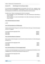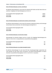 Anlage 4 – Erläuterungen zum Haushaltsplan 2020 Konto 7194 Abschreibungen von Hard- und Software Die jährlichen Abschreibungen für unter Konto 0712 aktivierte EDV-Geräte sind über dieses Konto vor- zunehmen. Festgelegt ist ein Abschreibungssatz von 33 1/3 v.H. Voraussichtliches Rechnungsergebnis 2019 7.500 € Ansatz 2019 7.500 € Ansatz 2020 9.500 € Konto 7195 Abschreibungen von medizinischen Geräten und Einrichtungen Die jährlichen Abschreibungen für unter Konto 0714 aktivierte medizinische Geräte und Einrichtungen sind auf diesem Konto vorzunehmen. Der Abschreibungssatz beträgt 20,0 v.H. Voraussichtliches Rechnungsergebnis 2019 0€ Ansatz 2019 0€ Ansatz 2020 0€ Konto 7196 Abschreibungen von technischen Anlagen Abschreibungen für technische Anlagen sind hier zu buchen. Der festgelegte Abschreibungssatz be- trägt 10 v.H. bis 33 1/3 v.H. entsprechend der voraussichtlichen Nutzungsdauer. Voraussichtliches Rechnungsergebnis 2019 0€ Ansatz 2019 0€ Ansatz 2020 0€ Konto 7199 Abschreibungen von sonstigen bewegliche Sachen Die jährlichen Abschreibungen für unter Konto 0719 dem Verwaltungsvermögen zugerechnete akti- vierte Bestände sind über dieses Konto vorzunehmen. Der jährliche Abschreibungssatz ist entspre- chend der voraussichtlichen Nutzungsdauer mit 10 v.H. bis 33 1/3 v.H. anzusetzen. Voraussichtliches Rechnungsergebnis 2019 0€ Ansatz 2019 0€ Ansatz 2020 0€ Seite | 21