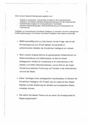 -4 - Dafür müssen folgende Bedingungen gegeben sein: Zugang zu preiswerter, erneuerbarer Energie für die Computerzentren Zugang zu schnellster Glas faser-Breitbandinfrastruktur für den Datentransfer - Ausreichendes Angebot an hochqualifizierten Fachkräften Attraktive Marktbedingungen, Wirtschaftsförderung und Anreizsysteme für Unternehmen Testfelder um Anwendungen Künstlicher Intelligenz zu erproben und eine umfangreiche Aufkläruпgskampagпe zum Nutzen Künstlicher Intelligenz seien ebenso notwendig. • BIWi beschäftigt sich zur Zeit intensiv mit der Frage, was wir als Bundesregierung zum Erhalt digitaler Souveränität im aufkommenden Zeitalter der Künstiichen Intelligenz tun müssen. • Nach unserer Analyse fehlt es an gemeinsamen Infrastrukturen zur Datenverarbeitung und Datenanalyse, es fehlt an einem strategischen Vehikel für Investments in Kl Unternehmen in der zweiten und dritten Wachstumsphase, und es fehlt an der engen Verzahnung zwischen Forschung und Transfer in die Unternehmen und auf den Markt. • Daher: benötigen einen strategischen Industrieakteur im Bereich der Künstlichen Intelligenz. Ein Projekt, das wir aufgrund des nötigen Kapitals und der Skalierung am ehesten auf europäischer Ebene umsetzen können. • Wie sehen Sie dieses Thema und wo sehen Sie Ansatzpunkte für Regierungshandeln?