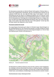 Die Neutrassierung beschreibt vom Bahnhof Rösrath Hoffnungsthal in Richtung Osten zu- nächst einen langgestreckten Rechtsbogen. Mit einer Eisenbahnbrücke überquert sie die Lüghauser Straße bevor der neue etwa 300 Meter lange Tunnel beginnt, in dem die Neutrassierung unter den Häusern am Pflipsberg durchgeführt wird. Am Ende des Tunnels wird die Hofferhofer Straße wieder mit einer Eisenbahnbrücke gekreuzt. Im weiteren Verlauf führt die Neutrassierung in Dammlage über eine Sportanlage hinweg, die zu verlegen wäre, bevor sie östlich des heutigen Bahnübergangs Brünsbacher Weg in den neuen Hoffnungs- thaler Tunnel mündet. Das östliche Ende des neuen Hoffnungsthaler Tunnels liegt etwa 300 Meter westlich des Haltepunkts Lohmar Honrath. Neutrassierungsabschnitt Overath Die vorgeschlagene Neutrassierung für diesen 2,4 Kilometer langen Abschnitt beginnt an der Eisenbahnüberführung in der Ortschaft Klein-Bombach und endet am Bahnhof Overath (Abbildung 73). Die Neutrassierung mit einer Entwurfsgeschwindigkeit von 120 km/h ließe eine Reduzierung der Fahrzeit um 86 Sekunden zu. Abbildung 73: Neutrassierungsabschnitt Overath Die Neutrassierung verläuft aus Richtung Lohmar Honrath zunächst in einem langgestreck- ten Linksbogen und kreuzt über Brücken die Zufahrt zur Siedlung Kombach, anschließend die Bundesstraße 484 und den Fluss Agger. Sie erreicht den zur Stadt Overath gehörenden Ortsteil Cyriax, wo die Gebäude und Sportanlagen eines Schulzentrums weichen müssten. Machbarkeitsstudie Ausbau Oberbergische Bahn 106