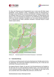 Der Berg nach Überquerung der Rospetalstraße muss in einem etwa 500 Meter langen geradlinigen Tunnel unterfahren werden. Anschließend verläuft die Neutrassierung in Hochlage in einem Rechtsbogen und direkt anschließendem Linksbogen nordwärts weiter. Die Ahlefelder Straße wird in einem Brückenbauwerk überquert. Die Bestandstrasse wird gekreuzt, bevor die Neutrassierung tangential an die Straßenführung der Westtangente südlich der Ortschaft Luttersiefen herangeführt wird. Eine weitere Eisenbahnüberführung ist zur Überquerung der Straße Luttersiefen erforderlich. Vereinzelte Häuser an dieser Straße müssten weichen. Abbildung 78: Neutrassierungsabschnitt Gummersbach Dieringhausen – Gummersbach 4.4 Kostenabschätzung Im Anschluss an die Bewertung der technischen Machbarkeit der Planfälle werden die Kos- ten abgeschätzt. Dies ersetzt keine detaillierte Kostenberechnung, die im Falle einer wei- terführenden Planung durchzuführen wäre. Die folgende Übersicht (Tabelle 19) zeigt die für die Einzelmaßnahmen der Planfälle 5a, 5b, 6a(I), 6a(II), 6b, 6c und 6d abschätzend ermittelten Kosten. In den Kostenschätzungen ist kein Lärmschutz enthalten. Dieser beläuft sich in den Planfällen 5a, 6a(I), 6a(II) und 6c auf ca. 36,9 Mio. EUR, in den Planfällen 6b und 6d auf ca. 39,9 Mio. EUR. Machbarkeitsstudie Ausbau Oberbergische Bahn 111