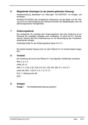 6 Mitgeltende Unterlagen (in der jeweils geltenden Fassung) Arbeitsanweisung „Bearbeiten von Störungen“ AA 09/STÖ/01 mit Anlagen und Anhängen. Richtlinie 2014/30/EU des europäischen Parlaments und des Rates vom 26. Feb- ruar 2014 zur Harmonisierung der Rechtsvorschriften der Mitgliedstaaten über die elektromagnetische Verträglichkeit. 7 Änderungsdienst Die vorliegende VA unterliegt dem Änderungsdienst. Bei einer Änderung ist ein Exemplar der ungültigen Ausgabe noch mindestens 10 Jahre bei 511 aufzube- wahren. Danach darf eine Aussonderung nur mit Genehmigung des Prozessver- antwortlichen erfolgen. Zuständige Stelle für den Änderungsdienst dieser VA: 511. Die jeweils aktuelle Fassung wird von dem Referat 511 im Intranet bekannt gege- ben. 8 Verteiler Die Verteilung wird durch das Referat 511 laut folgender Verteilerliste veranlasst. AbtL Z, 2, 4, 5 UAbtL Z2, 41 RefL Z 11, Z 22, Z 25, Z 26, 215, 221, 223, 224, 226, 411, 416, 511 sowie alle AStL, L DLZ 4, 5, 6, 7, 8, 10, 12 DLZ 11, Widerspruchs-Sb GPR 9 Anlagen Anlage 1 Schnittstellenbeschreibung (grafisch) VA 09/STÖ Stand:18.01.2017 Seite : 12/13