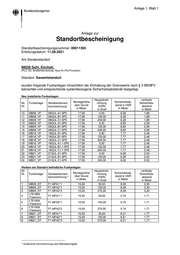 Standortbescheinigung Zum Nachweis der Gewährleistung des Schutzes von Personen in den durch den Betrieb von ortsfesten Funkanlagen entstehenden elektromagnetischen Feldern. Nach den der Bundesnetzagentur vorgelegten Antragsdaten wurde der Standort: STOB-Nr: 89011365 98528 Suhl, Kirchstr. (PLZ, Ort, Straße/Gemarkung, Haus Nr./Flur/Flurstück) nach den Regelungen der Verordnung über das Nachweisverfahren zur Begrenzung elektromagnetischer Felder (BEMFV) auf der Grundlage des § 32 des Gesetzes über die Bereitstellung von Funkanlagen auf dem Markt vom 27. Juni 2017 (BGBl. I 2017 S. 1947) bewertet und diese Bescheinigung erteilt. Die rechnerische Bewertung des Standortes (Standort im Sinne der BEMFV) erfolgte unter der Berücksichtigung aller am Standort installierten ortsfesten Funkanlagen (Anlage 1) sowie der am Standort bereits vorhandenen relevanten Feldstärken, die von umliegenden ortsfesten Funkanlagen ausgehen auf der Basis der Grenzwerte nach § 3 der BEMFV. Standortbezogene(r) Sicherheitsabstand bzw. –abstände: Hauptstrahlrichtung vertikal (90°) Montagehöhe der Bezugs- Standort [Meter] [Meter] antenne über Grund [Meter] Gesamtstandort 20,93 6,77 15,50 Entsprechend den Regelungen der BEMFV wird in dieser Standortbescheinigung zusätzlich für jede Sendeantenne, die bereits bei Festlegung des standortbezogenen Sicherheits- abstandes berücksichtigt wurde, ein systembezogener Sicherheitsabstand festgelegt. Die Anlage 1 weist den/die systembezogene(n) Sicherheitsabstand, bzw. -abstände zum Schutz von Personen in elektromagnetischen Feldern aus. Besonderer Hinweis Der Standort darf auch mit den der Standortbescheinigung Nr. 89011365 vom 12.11.2018 zugrunde liegenden Standortdaten betrieben werden. Für diesen Betriebszustand gelten der/die standortbezogene/n Sicherheitsabstand/-abstände aus der vorstehend genannten Bescheinigung, die hier als Anlage beigefügt ist. Die darin enthaltenen Festlegungen zum standortbezogenen Sicherheitsabstand/zu den standortbezogenen Sicherheitsabständen und die in der dortigen Anlage 1 ausgewiesenen systembezogenen Sicherheitsabstände für die dort aufgeführten Funkanlagen werden insoweit Bestandteil dieser Standortbescheinigung.