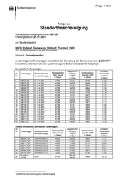 Anlage 1, Blatt 2 Die Emissionen der in der Standortbescheinigung berücksichtigten Sendeantennen sowie die von umliegenden ortsfesten Funkanlagen herrührenden relevanten Immissionen wurden bei der Festlegung des einzuhaltenden standortbezogenen Sicherheitsabstandes bzw. der einzuhaltenden Sicherheitsabstände (diese sind auf dem Deckblatt dieser Standortbescheinigung angegeben) berücksichtigt. Bundesnetzagentur Außenstelle Leipzig Diese Standortbescheinigung wurde maschinell erstellt und ist ohne Unterschrift gültig.