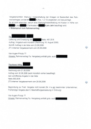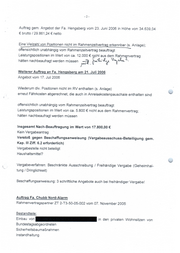 Vergaberechtlich: Wartung / Instandhaltung der Anlagen ist Bestandteil des Rah- menvertrages und ist mit € (Pos. 1.2.10) angeboten und bezuschlagt. Es ist nicht erkennbar, warum eine Wartung/Instandhaltung mit Kosten in Höhe von BE Pius: Fahrkosten -: pro Jahr beauftragt wird. = Widerspruch zum Rahmenvertrag SE Lieferung und Einsetzung von BE \ <:o 461,05 € Auftrag / Angebot wohl mündlich (Rechnung 16. August 2006) Schriftl. Auftrag in der Akte vom 23.08.2006 ZT 3-interner Vergabevermerk vom 25.08.2006 Vier-Augen-Prinzip ?? Hinweis: Rahmenvertrag Fa. Hengsberg enthält grds. auch re Tischlerei Hillig, RR Rechnung vom 21.08.2006 Auftrag vom 30.08.2006 (wohl mündlich vorher beauftragt) kein schriftliches Angebot in der Akte Netto 993,59 € ZT3-interner Vergabevermerk vom 29.08.2006 Begründung zur Freih. Vergabe nicht korrekt (Nr. 4 a ein bestimmter Unternehmer; Freihändige Vergabe aber It. Beschaffungsanweisung in Ordnung) Vier-Augen-Prinzip ?? Hinweis: Rahmenvertrag Fa. Hengsberg enthält grds. auch