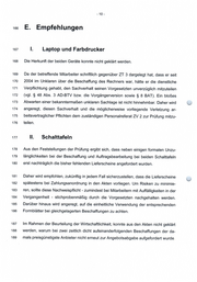 166 167 168 169 170 171 172 173 174 175 176 177 178 179 180 181 182 183 184 186 187 188 189 -10 - E. Empfehlungen I. Laptop und Farbdrucker Die Herkunft der beiden Geräte konnte nicht geklärt werden. Da der betreffende Mitarbeiter schriftlich gegenüber ZT 3 dargelegt hat, dass er seit 2004 im Unklaren über die Beschaffung des Rechners war, hätte er die dienstliche Verpflichtung gehabt, den Sachverhalt seinen Vorgesetzten unverzüglich mitzuteilen (vgl. 8 48 Abs. 3 AD-BTV bzw. die Vorgängerversion sowie & 8 BAT). Ein bloßes Abwarten einer bekanntermaßen unklaren Sachlage ist nicht hinnehmbar. Daher wird angeregt, diesen Sachverhalt und die möglicherweise vorliegende Verletzung ar- beitsvertraglicher Pflichten dem zuständigen Personalreferat ZV 2 zur Prüfung mitzu- teilen. ll. Schalttafeln Aus den Feststellungen der Prüfung ergibt sich, dass neben einigen formalen Unzu- länglichkeiten bei der Beschaffung und Auftragsbearbeitung bei beiden Schalttafeln erst nachträglich die bisher fehlenden Lieferscheine angefordert wurden. Daher wird empfohlen, zukünftig in jedem Fall sicherzustellen, dass die Lieferscheine spätestens bei Zahlungsanordnung in den Akten vorliegen. Um Risiken zu minimie- ren, sollte diese Nachweispflicht - zumindest bei Mitarbeitern mit Auffälligkeiten in der Vergangenheit - stichprobenmäßig durch die Vorgesetzten nachgehalten werden. Darüber hinaus wird angeregt, auf die einheitliche Verwendung der entsprechenden Formblätter bei gleichgelagerten Beschaffungen zu achten. Im Rahmen der Beurteilung der Wirtschaftlichkeit, konnte aus den Akten nicht geklärt werden, warum bei zwei zeitlich dicht aufeinanderfolgenden Beschaffungen der da- mals preisgünstigste Anbieter nicht erneut zur Angebotsabgabe aufgefordert wurde.