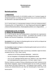Dienstanweisung Asylverfahren Bearbeitungsfristen 1. Allgemeines Die Verfahrensrichtlinie (Verf-RL, RL 2013/32/EU) enthält in Art. 31 konkrete Vorgaben für die Bearbeitungsfristen von Anträgen auf internationalen Schutz, die trotz der bisher fehlen- den Übernahme in das AsylG einzuhalten sind. Art. 31 Verf-RL findet nur in erstinstanzlichen Verfahren im Sinne der Verfahrensrichtlinie Anwendung (Erst- und Folgeverfahren), d.h. diese Regelung gilt insbesondere nicht für Widerrufs-/Rücknahmeverfahren, Wiederaufgreifensverfahren und in Klageverfahren . 2. Regelungen in Art. 31 Verf-RL 2.1 Beginn der Bearbeitungsfrist Art. 31 Verf-RL legt fest, dass das Prüfungsverfahren unbeschadet einer angemessenen und vollständigen Prüfung so rasch wie möglich – grundsätzlich aber innerhalb von sechs Monaten nach förmlicher Antragstellung – zum Abschluss gebracht wird. Grundsätzlich ist für den Beginn der Bearbeitungsfrist nach der Verf-RL der Zeitpunkt der förmlichen Antragstellung maßgeblich. Eine Ausnahme bezüglich des Beginns der Bearbeitungsfrist besteht nach der Verf-RL im Hinblick auf Dublin-Verfahren. Ist ein Antrag nach Maßgabe der Dublin III-Verordnung zu bearbeiten, beginnt die Sechs- monatsfrist nach Art. 31 Abs. 3 Satz 2 Verf-RL - „sobald der für die Prüfung zuständige Mitgliedstaat … bestimmt ist, - sich der Antragsteller im Hoheitsgebiet dieses Mitgliedstaats befindet - und er von der zuständigen Behörde betreut wird“ (Näheres zu den Fristen während des Zuständigkeitsbestimmungsverfahrens s. DA Dublin, Kapitel „Fristen“). Wurde ein Verfahren zur weiteren Prüfung und Bearbeitung eines Dublin-Verfahrens an den Dublin-Bereich abgegeben, beginnt die Bearbeitungsfrist nach der Verf-RL grundsätzlich mit dem Abbruch des Dublin-Verfahrens bzw. ‒ bei erfolglosem Dublin-Verfahren ‒ mit der Ausübung des Selbsteintrittsrechts oder Ablauf der Überstellungsfrist. Dieses Datum wird Bearbeitungsfristen 1/6 Stand 06/21