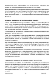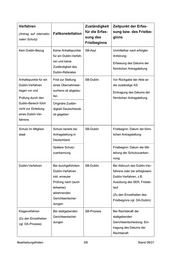 Verfahren Zuständigkeit Zeitpunkt der Erfas- für die Erfas- sung bzw. des Fristbe- (Antrag auf internatio- Fallkonstellation sung des ginns nalen Schutz) Fristbeginns Kein Dublin-Bezug Keine Anhaltspunkte SB-Asyl Unmittelbar nach erfolgter für ein Dublin-Verfah- Anhörung: ren und keine Erfassung des Datums der Zuständigkeit des förmlichen Antragstellung Dublin-Referates Anhaltspunkte für ein Frist zur Stellung SB-Dublin Vor Rückgabe der Akte an Dublin-Verfahren eines Übernahmeer- die zuständige AS: liegen vor und suchens ist abgelau- Eintragung des Datums der fen Prüfung durch den förmlichen Antragstellung Dublin-Bereich führt Originäre Zustän- nicht zur Einleitung digkeit Deutschlands eines Dublin-Ver- ist gegeben fahrens Schutz im Mitglied- Schutz bereits bei SB-Dublin Fristbeginn: Datum der förm- staat Antragstellung in lichen Antragstellung Deutschland Spätere Schutz- Fristbeginn: Datum der Mit- zuerkennung teilung der Schutzzuerken- nung Dublin-Verfahren Bei durchgeführtem SB-Dublin Bei Abbruch des Dublin-Ver- Dublin-Verfahren fahrens oder bei erfolglosem inkl. erneuter Dublin-Verfahren, z.B. Prüfung nach (auch Ausübung des SER, Fristab- teilweise) lauf ablehnenden (Zu den Einzelheiten des Gerichtsentschei- Fristbeginns vgl. DA-Dublin) dungen Klageverfahren Bei stattgebenden SB-Prozess Bei Rechtskraft der Gerichtsentschei- stattgebenden (Zu den Einzelheiten dungen Gerichtsentscheidung: Ein- vgl. DA-Prozess) tragung des Datums der Rechtskraft Bearbeitungsfristen 3/6 Stand 06/21