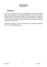 Dienstanweisung Asylverfahren Belehrungen Im Rahmen eines Asylgesuches bzw. einer Asylantragstellung ist der Ausländer schriftlich gegen Empfangsbekenntnis über seine Mitwirkungspflichten und die Folgen der Nichtbe- achtung zu belehren. Die Belehrungen erfolgen – je nach Art der Belehrung – entweder bei der Stelle, bei der er sich erstmals als Asylsuchender meldet (Grenzbehörde, Ausländerbe- hörde, Polizei oder Aufnahmeeinrichtung) oder dort, wo er einen wirksamen Asylantrag stellt (Außenstelle des Bundesamtes). Ausführliche Erläuterungen zu Inhalt und Aushändigung der verschiedenen Belehrungen finden sich in der DA-AVS/Belehrungen. Belehrungen 1/1 Stand 12/13