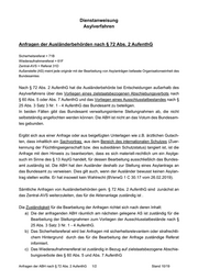 Dienstanweisung Asylverfahren Anfragen der Ausländerbehörden nach § 72 Abs. 2 AufenthG Sicherheitsreferat = 71B Wiederaufnahmereferat = 61F Zentral-AVS = Referat 31D Außenstelle (AS) meint jede originär mit der Bearbeitung von Asylanträgen befasste Organisationseinheit des Bundesamtes Nach § 72 Abs. 2 AufenthG hat die Ausländerbehörde bei Entscheidungen außerhalb des Asylverfahrens über das Vorliegen eines zielstaatsbezogenen Abschiebungsverbots nach § 60 Abs. 5 oder Abs. 7 AufenthG und das Vorliegen eines Ausschlusstatbestandes nach § 25 Abs. 3 Satz 3 Nr. 1 - 4 AufenthG das Bundesamt zu beteiligen. In beiden Fällen gibt das Bundesamt verwaltungsinterne Stellungnahmen ab, die nicht selbstständig angefochten werden können. Die ABH ist nicht an das Votum des Bundesam- tes gebunden. Ergibt sich aus einer Anfrage oder aus beigefügten Unterlagen wie z.B. ärztlichen Gutach- ten, dass inhaltlich ein Sachvortrag aus dem Bereich des internationalen Schutzes (Zuer- kennung der Flüchtlingseigenschaft bzw. des subsidiären Schutzstatus) tangiert ist, ist die Anfrage mit dem Hinweis zu beantworten, dass es sich materiell-rechtlich um ein Asylge- such im Sinne des § 13 AsylG handelt, für dessen Bearbeitung ausschließlich das Bundes- amt zuständig ist. Die ABH hat den Ausländer deshalb zur Stellung eines Asylantrags an das Bundesamt zu verweisen. Dies gilt auch, wenn der Ausländer bewusst keinen Asylan- trag stellen wollte. Er hat insoweit kein Wahlrecht (BVerwG 1 C 30.17 vom 26.02.2019). Sämtliche Anfragen von Ausländerbehörden gem. § 72 Abs. 2 AufenthG sind zunächst an das Zentral-AVS weiterzuleiten, das für die Aktenanlage zuständig ist . Die Zuständigkeit für die Bearbeitung der Anfragen richtet sich nach deren Inhalt: a) Die der anfragenden ABH räumlich am nächsten gelegene AS ist zuständig für die Bearbeitung der Stellungnahmen zum Vorliegen der Ausschlusstatbestände nach § 25 Abs. 3 Satz 3 Nr. 1 - 4 AufenthG. b) Das Sicherheitsreferat wird bei Anfragen mit sicherheitsrelevantem oder strafrechtli- chem Hintergrund durch das für die Bearbeitung der Anfrage zuständige Referat informiert. c) Das Wiederaufnahmereferat ist zuständig in Bezug auf zielstaatsbezogene Abschie- bungsverbote des § 60 Abs. 5 und Abs. 7 AufenthG Anfragen der ABH nach § 72 Abs. 2 AufenthG 1/2 Stand 10/19