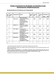 SEITE 24 VON 24 Anlage 6 Verzeichnis für die Abgabe von Schriftgut an das Zwischenarchiv (Abgabeverzeichnis) Bundesministerium für Ernährung und Landwirtschaft Archiv- Aktenzeichen 3) Laufzeit Laufzeit Aufbewahrung lfd. Betreff Band- Nr.1) Nr.2) Nr.4) von bis Dauer Ende Sammelsachakte: 1 09001/0010 Ressortübergreifende 1 2008 2010 15 2025 Politiken der Bundesregierung soweit nicht fachlich zuzuordnen, Allgemein 09503/0110 Recht des Internets - 2 Schutz von Domain- 3 2009 2012 15 2027 Namen 15211/0004 Erhaltung und 3 nachhaltige Nutzung 5 2012 2018 10 2028 tiergenetischer Ressourcen 66005/0054 Zukünftige Arbeit der 4 Fachagentur 1 2008 2009 20 2029 Nachwachsende Rohstoffe e.V. (FNR) 66005/0054 Zukünftige Arbeit der 5 Fachagentur 2 2009 2011 20 2031 Nachwachsende Rohstoffe e.V. (FNR) 6 1 Jede Aufbewahrungseinheit erhält eine lfd. Nr.; die Nummern sind jeweils einzeln aufzuführen. 2 Wird vom Zwischenarchiv ausgefüllt. Mit schriftlicher Zustimmung des Bundesarchivs kann die Archivnummer bereits vor der Abgabe eingetragen werden. 3 Sachliche Ordnung gemäß Aktenplan. Ist in der Abgabe das Schriftgut mehrerer Organisationseinheiten allein nach der Ordnung des Aktenplans aufgelistet, ist das Kennzeichen der jeweiligen Organisationseinheit in einer besonderen Spalte "Org.- Einheit" (zwischen Archivnummer und Aktenzeichen) und im Bezugsjahr im Vorblatt (Feld 8) anzugeben. 4 Anzugeben ist die lfd. Bandnummer, nicht die Zahl der Bände.
