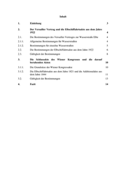 Inhalt 1. Einleitung 3 2. Der Versailler Vertrag und die Elbschiffahrtsakte aus dem Jahre 1922 4 2.1. Die Bestimmungen des Versailler Vertrages zur Wasserstraße Elbe 4 2.1.1. Allgemeine Bestimmungen für Wasserstraßen 4 2.1.2. Bestimmungen für einzelne Wasserstraßen 5 2.2. Die Bestimmungen der Elbschiffahrtsakte aus dem Jahre 1922 6 2.3. Gültigkeit der Bestimmungen 8 3. Die Schlussakte des Wiener Kongresses und die darauf beruhenden Akten 10 3.1.1. Die Grundsätze der Wiener Kongressakte 10 3.1.2. Die Elbschiffahrtsakte aus dem Jahre 1821 und die Additionalakte aus dem Jahre 1844 11 3.2. Gültigkeit der Bestimmungen 13 4. Fazit 14