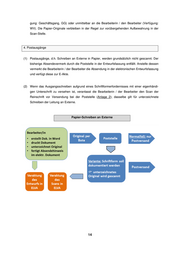 gung: Geschäftsgang, GG) oder unmittelbar an die Bearbeiterin / den Bearbeiter (Verfügung: WV). Die Papier-Originale verbleiben in der Regel zur vorübergehenden Aufbewahrung in der Scan-Stelle. 4. Postausgänge (1) Postausgänge, d.h. Schreiben an Externe in Papier, werden grundsätzlich nicht gescannt. Der bisherige Absendevermerk durch die Poststelle in der Entwurfsfassung entfällt. Anstelle dessen vermerkt die Bearbeiterin / der Bearbeiter die Absendung in der elektronischen Entwurfsfassung und verfügt diese zur E-Akte. (2) Wenn das Ausgangsschreiben aufgrund eines Schriftformerfordernisses mit einer eigenhändi- gen Unterschrift zu versehen ist, veranlasst die Bearbeiterin / der Bearbeiter den Scan der Reinschrift vor Versendung bei der Poststelle (Anlage 2); dasselbe gilt für unterzeichnete Schreiben der Leitung an Externe. Papier-Schreiben an Externe Bearbeiter/in Bearbeiter/in •• erstellt erstellt Dok. Dok. in in Word Word •• druckt druckt Dokument Dokument •• unterzeichnet unterzeichnet Original Original •• fertigt fertigt Absendehinweis Absendehinweis im im elektr. elektr. Dokument Dokument 14