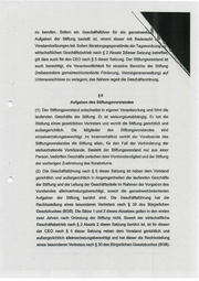 wirtschaftlichen Geschäftsbetrieb nach $ 2 Absatz 2dieser Satzung betreffen gilt dies auch für den CEO nach $ 5 dieser Satzung. Der Stiftungsvorstand ist auch berechtigt, die Verantwortlichkeit für einzelne Bereiche der Stiftung (insbesondere gemeinwohlorientierte Förderung, Vermögensverwaltung) auf Unterausschüsse zu verlagern; das Nähere regelt die Geschäftsordnung. 88 Aufgaben des Stiftungsvorstandes (1) Der Stiftungsvorstand entscheidet in eigener Verantwortung und führt die laufenden Geschäfte der Stiftung. Er ist weisungsunabhängig. Er hat die Stellung eines gesetzlichen Vertreters und vertritt die Stiftung gerichtlich und außergerichticb. Die Mitglieder des Stiftungsvorstandes sind einzelvertretungsberechtigt. Im Innenverhältnis vertritt der Vorsitzende des Stiftungsvorstandes die Stiftung allein, für den Fall der Verhinderung der stellvertretende Vorsitzende. Besteht der Stiftungsvorstand nur aus einer _ Person, bedürften Geschäfte zwischen dem Vorstandsmitglied und der Stiftung der vorherigen Zustimmung des Kuratoriums. (2) Die Geschäftsführung nach $ 6 dieser Satzung ist neben dem Vorstand gerichtlich und außergerichtlich in Angelegenheiten der laufenden Geschäfte der Stiftung und der Leitung der Geschäftsstelle im Rahmen der Vorgaben des Vorstandes alleinvertretungsberechtigt, soweit die gemeinwohlorientierten Aufgaben der Stiftung berührt sind. Die Geschäftsführung hat: die Rechtsstellung eines besonderen Vertreters nach $ 30 des Bürgerlichen Gesetzbuches (BGB). Die Sätze 1 und 2 dieses Absatzes gelten in den ersten zwei Jahren nach Gründung der Stiftung nicht. Soweit der wirtschaftliche Geschäftsbetrieb nach $ 2 Absatz 2 dieser Satzung berührt ist, ist für diesen der CEO nach 8 5 dieser Satzung neben dem Vorstand gerichtlich und außergerichtlich alleinvertretungsberechtigt und hat dieser die Rechtsstellung eines besonderen Vertreters nach $ 30 des Bürgerlichen Gesetzbuches (BGB).