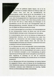ier Form mit qualifizierter digitaler Signatur, wie es sie das che Gesetzbuch im jeweiligen Zeitpunkt der Erklärung vorgibt, oder | einfache Email, wenn dies die Geschäftsordnung des E tungsvorstandes vorsieht. Gleiches gilt für den Geschäftsführer für die F' „emeinwohlorientierten Aufgaben der Stiftung, sofern ein solcher bestellt wurde; sofern Beratungsgegenstände der Tagesordnung den wirtschaftlichen Geschäftsbetrieb nach $ 2 Absatz 2 Satz 2 dieser Satzung betreffen, gilt dies auch für den CEO nach $ 5 dieser Satzung; die Einladungen an den Geschäftsführer und den CEO sind für eine ordnungsgemäße Ladung der Stiftungsvorstandssitzung unerheblich. Sitzungen sind ferner einzuberufen, wenn ein Mitglied des Stiftungsvorstandes dies verlangt. | (2) Jedes Vorstandsmitglied hat nur eine Stimme. Die Vorstandsmitgliedschaft ist eine höchstpersönliche Funktion; die Stimme kann nicht auf andere Vorstandsmitglieder übertragen werden, Vertretungen sind nicht zulässig. (3) Vorstandsmitglieder können nicht an der Beratung und Abstimmung von Angelegenheiten teilnehmen, wenn die Entscheidung ihnen selbst, ihren Ehegatten bzw. Lebenspartnern oder einem sonstigen Angehörigen, einer anderen in ihrem Haushalt lebenden Person oder einer durch ein Vorstandsmitglied kraft Gesetzes oder Vollmacht zu vertretenden Person einen unmittelbaren Vorteil oder Nachteil bringen kann. (4) Der Stiftungsvorstand ist bei ordnungsgemäßer Landung beschlussfähig. Ladungsfehler gelten als geheilt, wenn alle Mitglieder anwesend sind und niemand widerspricht. Wird die Beschlussfähigkeit nicht erreicht, so lädt die | oder der Vorsitzende unverzüglich zu einer Vorstandssitzung mit: gleicher Tagesordnung zwei Wochen später'mit einer Ladungsfrist von einer Woche ein. Diese Folgesitzung ist : unabhängig von der Zahl der anwesenden Vorstandsmitglieder beschlussfähig, wenn zumindest die bzw. der Vorsitzende anwesend ist. (5) Der Stiftungsvorstand trifft seine Entscheidungen mit einfacher Mehrheit der abgegebenen Stimmen, sofern die Satzung oder die Geschäftsordnung nichts Abweichendes bestimmen. Bei Stimmengleichheit gibt die Stimme des Vorsitzenden, ersatzweise seines Stellvertreters den Ausschlag. Ungültige Stimmen und Stimmenthaltungen bleiben unberücksichtigt.