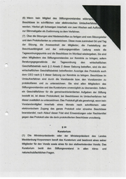 (6) Wenn kein Mitglied des Stiftungsvorstandes widerspri Beschlüsse im schriftlichen oder elektronischen Umlaufverfahren werden. Hierbei gilt Schweigen innerhalb von zwei Wochen seit Auffor zur Stimmabgabe als Zustimmung zu dem Verfahren. (7) Über die Sitzungen sind Niederschriften zu fertigen und vom Sitzungsleiter und dem Protokollanten zu unterzeichnen. Diese muss zumindest Ort und Tag der Sitzung, die Anwesenheit der Mitglieder, die Feststellung der Beschlussfähigkeit und der ordnungsgemäßen Ladung sowie die Tagesordnungspunkte und die Beschlüsse im Wortlaut wiedergeben. Sie sind ‘allen Mitgliedern des Stiftungsvorstandes zur Kenntnis zu bringen; sofern Beratungsgegenstände der Tagesordnung den wirtschaftlichen Geschäftsbetrieb nach $ 2 Absatz 2 dieser Satzung betreffen, sind die den wirtschaftlichen Geschäftsbetrieb betreffenden Auszüge des Protokolls auch dem CEO nach $ 5 dieser Satzung zur Kenntnis zu bringen. Beschlüsse im Umlaufverfahren sind durch die Vorsitzende bzw. den Vorsitzenden zu protokollieren und zu unterzeichnen. Sie sind allen Mitgliedern des Stiftungsvorstandes und des Kuratoriums unverzüglich zu übersenden. Sofern ein Geschäftsführer für die gemeinwohlorientierten Aufgaben der Stiftung bestellt ist, ist dieser Protokollant; bei Beschlüssen im Umlaufverfahren hat dieser zusätzlich zu unterzeichnen. Das Protokoll gilt als genehmigt, wenn kein Vorstandsmitglied innerhalb eines Monats nach schriftlichem oder elektronischem Zugang das ganze Protokoll oder einzelne Beschlüsse beanstandet; nach Ablauf dieser Frist sind Einwendungen oder Rechtsmittel gegen das Protokoll oder die darin protokollierten Beschlüsse unzulässig. 810 Kuratorium (1) Die Ministerpräsidentin oder der Ministerpräsident des Landes Mecklenburg-Vorpommern beruft das Kuratorium und bestimmt eines seiner Mitglieder für den Vorsitz sowie eines für den stellvertretenden Vorsitz. Das Kuratorium berät den Stiftungsvorstand in allen klima- und naturschutzfachlichen Fragen. |