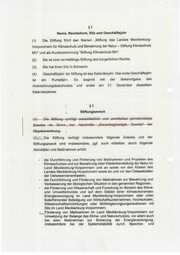 81 Name, Rechtsform, Sitz und Geschäftsjahr (1) Die Stiftung führt den Namen „Stiftung des Landes Mecklenburg- Vorpommern für Klimaschutz und Bewahrung der Natur — Stiftung Klimaschutz MV“ und als Kurzbezeichnung “Stiftung Klimaschutz MV”. (2) Sie ist eine rechtsfähige Stiftung des bürgerlichen Rechts. (3) Sie hat ihren Sitz in Schwerin. (4) Geschäftsjahr der Stiftung ist das Kalenderjahr. Das erste Geschäftsjahr ist ein : Rumpfjair. Es beginnt mit der Bekanntgabe des Anerkennungsbescheides und endet am 31. Dezember desselben Kalenderjahres. $2 y Stiftungszweck (241) Die Stiftung verfolgt insbesondere folgende Zwecke und der Stiftungszweck wird insbesondere, ggf. auch mittelbar, durch folgende Aktivitäten und Maßnahmen erfüllt: - die Durchführung und Förderung von Maßnahmen und Projekten des Klimaschutzes und zur Bewahrung oder Wiederherstellung der Natur im Land Mecklenburg-Vorpommern und an sowie vor den Küsten des Landes Mecklenburg-Vorpommern sowie an und vor den Ostseeküsten der Ostseeanrainerstaaten; - die Durchführung und Förderung von Maßnahmen zur Bewahrung und Verbesserung der ökologischen Situation in den genannten Regionen; “- die Förderung von Wissenschaft und Forschung im Bereich des Klima- und Umweltschutzes und auf dem Gebiet einer klimaschonenden Energieversorgung im Land Mecklenburg-Vorpommern oder unter federführender Beteiligung von Wirtschaftsunternehmen, Hochschulen, Wissenschaftseinrichtungen oder Nichtregierungsorganisationen mit Sitz im Land Mecklenburg-Vorpommern; -__Förderung von Maßnahmen im Land Mecklenburg-Vorpommern zur Umsetzung der Belange des Klima- und Naturschutzes, vor allem auch bei allen Maßnahmen zur Sicherung der Energieversorgung, insbesondere bei der Systemstabilität durch Speicher- und