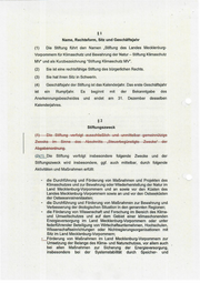 81 Name, Rechtsform, Sitz und Geschäftsjahr (1) Die Stiftung führt den Namen „Stiftung des Landes Mecklenburg- - Vorpommern für Klimaschutz und Bewahrung der Natur — Stiftung Klimaschutz MV“ und als Kurzbezeichnung “Stiftung Klimaschutz MV”. (2) Sie ist eine rechtsfähige Stiftung des bürgerlichen Rechts. (3) Sie hatihren Sitz in Schwerin. (4) Geschäftsjahr der Stiftung ist das Kalenderjahr. Das erste Geschäftsjahr ist ein Rumpfiahr. Es beginnt mit der Bekanntgabe des Anerkennungsbescheides und endet am 31. Dezember desselben Kalenderjahres. 2 Stiftungszweck @%1) Die Stiftung verfolgt insbesondere folgende Zwecke und der Stiftungszweck wird insbesondere, ggf. auch mittelbar, durch folgende Aktivitäten und Maßnahmen erfüllt: - die Durchführung und Förderung von Maßnahmen und Projekten des Klimaschutzes und zur Bewahrung oder Wiederherstellung der Natur im Land Mecklenburg-Vorpommern und an sowie vor den Küsten des Landes Mecklenburg-Vorpommern sowie an und vor den Ostseeküsten der Ostseeanrainerstaaten; - die Durchführung und Förderung von Maßnahmen zur Bewahrung und. Verbesserung der ökologischen Situation'in den genannten Regionen; - die Förderung von Wissenschaft und Forschung im Bereich des Klima- und Umweltschutzes und auf dem Gebiet einer klimaschonenden Energieversorgung im Land Mecklenburg-Vorpommern oder unter federführender Beteiligung von Wirtschaftsunternehmen, Hochschulen, Wissenschaftseinrichtungen oder Nichtregierungsorganisationen mit Sitz im Land Mecklenburg-Vorpommern; -_Förderung von Maßnahmen im Land Mecklenburg-Vorpommern zur Umsetzung der Belange des Klima- und Naturschutzes, vor allem auch _ bei allen Maßnahmen zur Sicherung der Energieversorgung, insbesondere bei der Systemstabilität durch Speicher- und