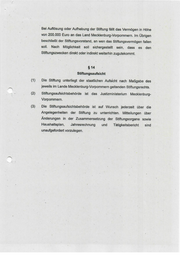 (1) (2) (8) Bei Auflösung oder Aufhebung der Stiftung fällt das Vermögen in Höhe von 200,000 Euro an das Land Mecklenburg-Vorpommern. Im Übrigen beschließt der Stiftungsvorstand, an wen das Stiftungsvermögen fallen soll. Nach Möglichkeit soll sichergestellt sein, dass es den Stiftungszwecken direkt oder indirekt weiterhin zugutekommt. 814 Stiftungsaufsicht Die Stiftung unterliegt der staatlichen Aufsicht nach Maßgabe des jeweils im Lande Mecklenburg-Vorpommern geltenden Stiftungsrechts. Stiftungsaufsichtsbehörde ist das Justizministerium Mecklenburg- Vorpommern. Die Stiftungsaufsichtsbehörde ist auf Wunsch jederzeit über die Angelegenheiten der Stiftung zu unterrichten. Mitteilungen über Änderungen in der Zusammensetzung der Stiftungsorgane sowie Haushaltsplan, Jahresrechnung und Tätigkeitsbericht sind unaufgefordert vorzulegen.