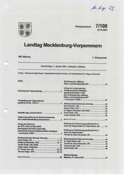 Am Le 35 71/108 07.01.2021 Plenarprotokoll Landtag Mecklenburg-Vorpommern 108, Sitzung 7. Wahlperiode Donnerstag, 7. Januar 2021, Schwerin, Schloss Vorsitz: Präsidentin Birgit Hesse, Vizepräsidentin Beate Schlupp und Vizepräsidentin Dr. Mignon Schwenke Inhalt Änderung der Tagesordnung .......... ER :2 Feststellung der Tagesordnung gemäß 8 73 Abs. 3GOLT .....aensceneessenssnsannnnenensnennenene 2 Aktuelle Lage „Corona-Virus“ ....... bernesssnnsssnssserssnunnsen 2 Regierungserklärung der Ministerpräsidentin des Landes Mecklenburg-Vorpommenn .......uuuccc. 2 Antrag der Fraktionen . ‘der SPD, CDU und DIE LINKE Konsequenz ist weiter notwendig: Gemeinsam Corona-Infektionszahlen verringern — Drucksache 715697 = anna... VER 2 Ministerpräsidentin Manuela SCHWESIG sicscsssiuseansäcienannenn 2 Horst Förster, AfD .uunsessensensennennennnenn. energie 7,17 Wolfgang Waldmüller, CDU ...nessnsensananaeunneennenenn 12, 1 Torsten Koplin, DIE LINKE ............ nee 18 Holger Arppe, fraktionslos ....ussaennannanaaeenennnsnenaeneennnnnn 23 Dr. Gunter Jess, AfD .nesssnssssssnanannonsenneunsunannnanneneene 23, 28 Thomas Krüger, SPD ............. Nr 24,29 BORN nem 29 Errichtung der „Stiftung Klima- und Umweltschutz MV“... 30 “ Antrag der Landesregierung Zustimmung des Landtages gemäß 8 63 Absatz 1 LHO hier: Errichtung der „Stiftung Klima- und Umweltschutz MV“ _ Drucksache IRB innen 30 Ministerpräsidentin Manuela Schwesig Bert Obereiner, AfD Dietmar Eifler, CDU nunnnnsttnnnn nun hanu nn een ur an ar tnnenne BarnsnsssssnH stern une sn een nun n nn ne nennen BARnHSHHRAn SHELL SHE ET Enns nn nenne nenne Beschluss a ennentnssnansshensenssnensönsennsnnerssnninee 41 Erklärung zur.Abstimmung gemäß 895 GOLT durch den Abgeordneten Dr. Ralph Weber, AfD .......... 41 Erklärung zur Abstimmung gemäß $ 96 GOLT durch den Abgeordneten Thomas de Jesus Fernandes, AfD Thomas Krüger, SPD Horst Förster, AfD ......... Nächste Sitzung Mittwoch, 27. Januar 2021