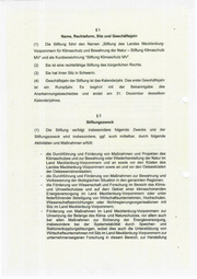 sı Name, Rechtsform, Sitz und Geschäftsjahr (1) Die Stiftung führt den Namen „Stiftung des Landes Mecklenburg- Vorpommern für Klimaschutz und Bewahrung der Natur - Stiftung Klimaschutz MV“ und als Kurzbezeichnung “Stiftung Klimaschutz MV”. (2) Sie ist eine rechtsfähige Stiftung des bürgerlichen Rechts. (3) Sie hat ihren Sitz in Schwerin. (4) Geschäftsjahr der Stiftung ist das Kalenderjahr. Das erste Geschäftsjahr ist ein Rumpfiahrr. Es beginnt mit der Bekanntgabe des Anerkennungsbescheides und endet am 31. Dezember desselben Kalenderjahres. 82 Stiftungszweck (1) Die Stiftung verfolgt insbesondere folgende Zwecke und der . Stiftungszweck wird insbesondere, ggf. auch mittelbar, durch folgende Aktivitäten und Maßnahmen erfüllt: - die Durchführung und Förderung von Maßnahmen und Projekten des Klimaschutzes und zur Bewahrung oder Wiederherstellung der Natur im Land Mecklenburg-Vorpommern und 'an sowie vor den Küsten des Landes Mecklenburg-Vorpommern sowie an und vor den Ostseeküsten der Ostseeanrainerstaaten; - die Durchführung und Förderung von Maßnahmen zur Bewahrung und’ Verbesserung der ökologischen Situation in den genannten Regionen; - die Förderung von Wissenschaft und Forschung im Bereich des Klima- und Umweltschutzes und auf dem Gebiet einer klimaschonenden Energieversorgung im Land Mecklenburg-Vorpommern oder unter federführender Beteiligung von Wirtschaftsunternehmen, Hochschulen, Wissenschaftseinrichtungen oder Nichtregierungsorganisationen mit Sitz im Land Mecklenburg-Vorpommern; - Förderung von Maßnahmen im Land Mecklenburg-Vorpommern zur Umsetzung der Belange des Klima- und Naturschutzes, vor allem auch bei allen Maßnahmen zur Sicherung der Energieversorgung, - insbesondere bei der Systemstabilität durch Speicher- und Sektorenkopplungslösungen, wobei dies auch die Unterstützung von Wirtschaftsunternehmen mit Sitz im Land Mecklenburg-Vorpommern zur unternehmenseigenen Forschung in diesem Bereich, zur Herstellung