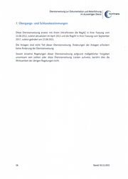 Dienstanweisung zur Dokumentation und Aktenführung im Auswärtigen Dienst #zumVorgang 7. Übergangs- und Schlussbestimmungen Diese Dienstanweisung ersetzt mit ihrem Inkrafttreten die RegAZ in ihrer Fassung vom 15.08.2012, zuletzt aktualisiert im April 2013 und die RegAV in ihrer Fassung vom September 2017, zuletzt geändert am 22.09.2021. Die Anlagen sind nicht Teil dieser Dienstanweisung. Änderungen der Anlagen erfordern keine Änderung der Dienstanweisung. Soweit einzelne Regelungen dieser Dienstanweisung aufgrund maßgeblicher Vorgaben unwirksam sein sollten oder diese Dienstanweisung Lücken aufweist, berührt dies die Wirksamkeit der übrigen Regelungen nicht. 26 Stand: 02.12.2021