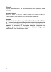 Trinkgeld Trinkgeld ist in Höhe von 5 % des Rechnungsbetrages üblich (soweit nicht bereits enthalten). Sehenswürdigkeiten Historische Altstadt mit Moscheen und Shirvanshah Palast, Villen der Ölbarone, Teppichmuseum, Heydar-Aliyev-Zentrum, der historische Feuertempel . Sonstiges Aserbaidschan ist ein muslimisches, gemischt-konfessionelles Land (60 % Schiiten, 40 % Sunniten; christliche und jüdische Minderheiten), das sich durch große religiöse Toleranz auszeichnet. Für Baku gilt: es gibt keine wesentlichen Unterschiede in der Bekleidung zu Deutschland. Für das Betreten islamischer Gebetshäuser und Heiligtümer gelten die üblichen Vorschriften. Militärische Anlagen und Polizeistationen dürfen nicht fotografiert werden. 2
