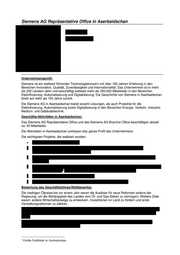 Siemens AG Repräsentative Office in Aserbaidschan Unternehmensprofil: Siemens ist ein weltweit führender Technologiekonzern mit über 165 Jahren Erfahrung in den Bereichen Innovation, Qualität, Zuverlässigkeit und Internationalität. Das Unternehmen ist in mehr als 200 Ländern aktiv und beschäftigt weltweit mehr als 350.000 Mitarbeiter in den Bereichen Elektrifizierung, Automatisierung und Digitalisierung. Die Geschichte von Siemens in Aserbaidschan blickt auf mehr als 150 Jahre zurück. Die Siemens AG in Aserbaidschan bietet sowohl Lösungen, als auch Produkte für die Elektrifizierung, Automatisierung sowie Digitalisierung in den Bereichen Energie, Verkehr, Industrie, Medizin- und Gebäudetechnik. Geschäfte/Aktivitäten in Aserbaidschan: Das Siemens AG Repräsentative Office und das Siemens AG Branche Office beschäftigen aktuell ca. 50 Mitarbeiter. Die Aktivitäten in Aserbaidschan umfassen das ganze Profil des Unternehmens. Die wichtigsten Projekte, die realisiert wurden: Bewertung des Geschäftsklimas/Wettbewerbs: Die niedrigen Ölpreise bis vor einem Jahr waren die Auslöser für neue Reformen seitens der Regierung, um die Abhängigkeit des Landes vom Öl- und Gas-Sektor zu verringern. Weitere Ziele waren: andere Wirtschaftszweige zu entwickeln, Investitionen im Land zu fördern und erste Verwaltungsreformen zu stärken. 1 Größte Stahlhütte in Aserbaidschan