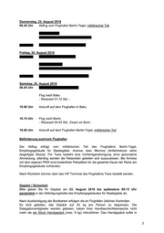 Donnerstag, 23. August 2018 09.45 Uhr Abflug vom Flughafen Berlin-Tegel, militärischer Teil Freitag, 24. August 2018 Samstag, 25. August 2018 08.45 Uhr Flug nach Baku - Reisezeit 01:15 Std. - 10.00 Uhr Ankunft auf dem Flughafen in Baku 16.15 Uhr Flug nach Berlin - Reisezeit 04:45 Std., Essen an Bord - 19.00 Uhr Ankunft auf dem Flughafen Berlin-Tegel, militärischer Teil Beförderung zum/vom Flughafen Der Abflug erfolgt vom militärischen Teil des Flughafens Berlin-Tegel, Empfangsgebäude für Staatsgäste, Avenue Jean Mermoz (Anfahrtskizze siehe beigefügte Skizze). Für Taxis besteht eine Vorfahrtgenehmigung ohne gesonderte Anmeldung, allerding werden die Reisenden gebeten sich auszuweisen. Bei Anreise mit dem eigenen PKW sind kostenfreie Parkplätze für die gesamte Dauer der Reise am Empfangsgebäude vorhanden. Nach Rückkehr können über das VIP Terminal des Flughafens Taxis bestellt werden. Gepäck / Sicherheit Bitte geben Sie Ihr Gepäck am 23. August 2018 bis spätestens 09:15 Uhr persönlich in der Abfertigungshalle des Empfangsgebäudes für Staatsgäste ab. Nach Aushändigung der Bordkarten erfolgen die an Flughäfen üblichen Kontrollen. Es wird gebeten, das Gepäck auf 20 kg pro Person zu begrenzen. Die Delegationsmitglieder werden gebeten, neben ihrer Handtasche/Aktentasche nicht mehr als ein Stück Handgepäck (max. 8 kg) mitzuführen. Das Handgepäck sollte in 2