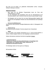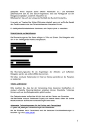 Der Kauf und die Einfuhr von gefälschten Markenartikeln (Uhren, Computer, Software, Kleidung) ist verboten. Allgemeine Hinweise - Bitte sehen Sie bei offiziellen Programmteilen davon ab, Fotos oder Videoaufnahmen zu machen. - Für die Angehörigen des Auswärtigen Amts wird ein Sammelantrag für die Dienstreise gestellt. Jeder Teilnehmer erhält eine Kopie des genehmigten Antrags. - Die Delegation wird von einem Arzt und einem Rettungssanitäter begleitet. Bitte beachten Sie die beigefügten Hinweise des Gesundheitsdienstes des Auswärtigen Amts. - Sonnenschutz/Medikamente Sonnenschutz sowie persönlich benötigte Medikamente sollten im Reisegepäck nicht fehlen. - Kleiderordnung Die Kleiderordnung bei offiziellen Terminen entspricht der in Deutschland. - Wetter Es ist mit heißen, sehr sonnigen Temperaturen von z.T. über 30 Grad tagsüber zu rechnen. Weitere Angaben finden Sie in den beigefügten Länderinformationen. Weitere Informationen entnehmen Sie bitte den beigefügten Anlagen: - Länderinformationen - Medizinische Hinweise des Gesundheitsdienstes im Auswärtigen Amt - Anfahrtsplan zum Flughafen Berlin-Tegel, militärischer Teil - Merkblatt des Bundeskriminalamts Für Rückfragen stehen wir Ihnen gerne zur Verfügung. Mit freundlichen Grüßen (Programm) (Logistik) Tel: Tel: Mobiltelefon: Mobiltelefon: 4