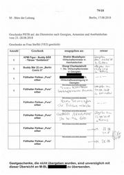 79/18 M - Büro der Leitung Berlin, 17.08.2018 Geschenke PSTB anl. der Dienstreise nach Georgien, Armenien und Aserbaidschan vom 23.-28.08.2018 Geschenke an Frau Steffel (VEЭ) geschickt: Anzahl Geschenk ausgegeben an: retour KPM Figur - Buddy BAR shahin Mustafayev Сvjеzt-Q . 1 - Tänzer "Goldstück" Wirtschaftsminister in Aserbaidschan Giorgi Cherkezishvili ~ гΡ- Buddy Bar 22 cm Berlin 1 „ 1. Stv. Wirtschaftsminister Comic 11 in Georgien « f-' S 1 Füllhalter Pelikan „Pura" Dt. — 7 silber Wirtschaftsvereinigung in Georgien Bitte eintragen und an M-BL übermitteln Füllhalter Pelikan „Pura" Bitte eintragen und an M-BL übermitteln Füllhaltv^ -r Peli kan „ Pura" S'i + T +л G' silber c~~ ~, Bitte eintragen und an M-BL übermitteln Füllhalter Pelikan „Pura" silber _ 13 Q>зΡ_2ö Е Jv.. "д/ , t"á Bitte eintragen und an M-BL (ibermitteln Füllhalter Pelikan „Pura" silber Bitte eintragen und an I -BL ubermitteln ~I Füllhalter Pelikan „Pura" 5 ---\--\ Z silber - ~ Gastgeschenke, die nicht übergeben wurden, sind unverzüglich mit dieser Übersicht an M-BL zu übersenden.