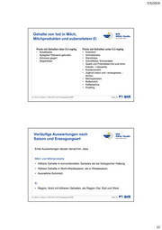 7/3/2019 Gehalte von Iod in Milch, Milchprodukten und zubereitetem Ei Pools mit Gehalten über 0,3 mg/kg Pools mit Gehalten unter 0,3 mg/kg - Schafskäse • Kuhmilch - Spiegelei/ Hühnerei gebraten • Schmelzkäse - Hühnerei gegart • Weichkäse - Ziegenkäse • Schnittkäse, Emmentaler • Quark und Frischkäse (mit und ohne Kräuter, +-desserts) • Kondensmilch • Joghurt (natur und –erzeugnisse, - drinks) • Milchspeiseeis • Buttermilch • Kaffeesahne • Pudding Dr. Oliver Lindtner, 12.06.2019, Iod Fachgespräch BfR Seite 23 Vorläufige Auswertungen nach Saison und Erzeugungsart Erste Auswertungen deuten darauf hin, dass Milch und Milchprodukte • Höhere Gehalte in konventionellen Samples als bei biologischer Haltung • Höhere Gehalte in Nicht-Weidesaison, als in Weidesaison • Ausnahme Kuhmilch Ei • Region, Nord mit höheren Gehalten, als Region Ost, Süd und West Dr. Oliver Lindtner, 12.06.2019, Iod Fachgespräch BfR Seite 24 12