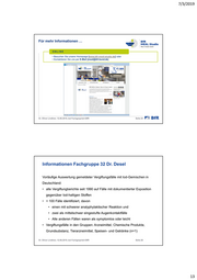 7/3/2019 Für mehr Informationen K ONLINE • Besuchen Sie unsere Homepage [www.bfr-meal-studie.de] oder • Kontaktieren Sie uns per E-Mail [meal@bfr.bund.de] Dr. Oliver Lindtner, 12.06.2019, Iod Fachgespräch BfR Seite 25 Informationen Fachgruppe 32 Dr. Desel Vorläufige Auswertung gemeldeter Vergiftungsfälle mit Iod-Gemischen in Deutschland: • alle Vergiftungberichte seit 1990 auf Fälle mit dokumentierter Exposition gegenüber Iod-haltigen Stoffen • < 100 Fälle identifiziert, davon • einen mit schwerer analyphylaktischer Reaktion und • zwei als mittelschwer eingestufte Augenkontaktfälle • Alle anderen Fällen waren als symptomlos oder leicht • Vergiftungsfälle in den Gruppen: Arzneimittel, Chemische Produkte, Grundsubstanz, Tierarzneimittel, Speisen- und Getränke (n=1) Dr. Oliver Lindtner, 12.06.2019, Iod Fachgespräch BfR Seite 26 13