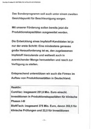 DocuSign Envelope ID: 6367FBBC-75C1-4F3C-A701-D21078225254 Das Sonderprogramm soll auch unter einem zweiten Gesichtspunkt für Beschleunigung sorgen. Mit unserer Förderung sollen bereits jetzt die Produktionskapazitäten ausgeweitet werden. Die Entwicklung eines Impfstoff-Kandidaten ist ja nur der erste Schritt: Eine mindestens genauso große Herausforderung ist es, den zugelassenen Impfstoff hierzulande und weltweit auch in ausreichender Menge herzustellen und rasch zur Verfügung zu stellen. Entsprechend unterstützen wir auch die Firmen im Aufbau von Produktionsstätten in Deutschland. Reaktiv: CureVac: insgesamt 251,6 Mio. Euro einschl. Investitionen in Produktionskapazitäten für klinische Phasen I-Ill BioNTech: insgesamt 375 Mio. Euro, davon 352,5 für klinische Prüfungen und 22,5 für Investitionen