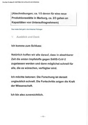 DocuSign Envelope ID: 6367FBBC-75C1-4F3C-A701-D21078225254 (Abschreibungen; ca. 1/3 davon für eine neue Produktionsstätte in Marburg, ca. 2/3 gehen an Kapazitäten von Unterauftragnehmern) Das meiste Geld geht in die klinischen Prüfungen rn Ausblick und Dank Ich komme zum Schluss: Natürlich hoffen wir alle darauf, dass in absehbarer Zeit die ersten Impfstoffe gegen SARS-CoV-2 zugelassen werden und dann möglichst schnell für alle, die es wünschen, verfügbar sind. Ich möchte betonen: Die Forschung ist derzeit unglaublich schnell. Die Fortschritte zeigen die Kraft der Wissenschaft. Ich bin also zuversichtlich. -10-