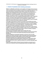 Sonderprogramm zur Beschleunigung von Forschung und Entwicklung dringend benötigter Impfstoffe gegen SARS-CoV-2 CONFIDENTIAL IDT INFORMATION c. Aspects of exploitation after marketing authorisation Based on a collaboration contract that is under negotiation IDT Biologika GmbH will hold the relevant commercial licenses to background and foreground IP generated under this funding and be responsible for the product licensure strategy. If commercially reasonable the applicant and marketing authorization holder for the submission of the Product will be IDT Biologika GmbH. Alternatively the Product may be licensed to third parties taking into consideration of manufacturing capacities, national presence and an equitable access approach. This could be a partner of IDT amongst the world’s leading Top Vaccine Companies (Big Pharma) or other competent pharmaceutical partners in BRIC or developing countries. In this case it should be assured that all information will be provided and the licensure of the Product will be obtained. WHO Prequalification is targeted. Further a cooperation with the relevant NGO’s as CEPI/ GAVI will be evaluated to ensure an equitable access to the vaccine in the context of urgency and outbreaks. At this stage no final definition for licensure of the vaccine can be provided since success and proven indications are not known yet. Approval of the vaccine in the European Economic Area (EEA) atthe EMA and the consecutive approval of the vaccine in COVID-19 affected countries outside the EEA is the most likely approach. The development does not currently take into account specific requirements for submission of a BLA to the US FDA. For application of a European Marketing Authorization the clinical Phase Ill study should be completed. Atthis stage we consider the possibility to apply an MAA for conditional licensing at EMA. Our CMC and clinical development program is aimed at completion of essential validation and qualification studies for filing an MAA. The approval of the authorization strategy requires Scientific EMA Advice. We are committed to provide the vaccine as early as possible to the German and European population. Due to the unknown dose regimen final pricing of the product cannot be calculated yet. As soon as possible and commercially reasonable we would like to enter into supply negotiation with German authorities for supply of guaranteed vaccines doses with defined tiered pricing and Germany’s supply strategy (as Germany already ordered quantities of AstraZeneca’s potential COVID-19 adenovirus-based vaccine candidate. Our price per dose should be calculated based on typically used in Public Sector Agency purchases considering all direct and indirect Cost of Goods for manufacturing for such vaccine provided that all costs for supportive activities and a commercial reasonable margin are included. Pricing of the vaccine outside of Germany/ Europe will basically be calculated based on market prices considering a broad and equitable global access to the epidemic vaccine. 39