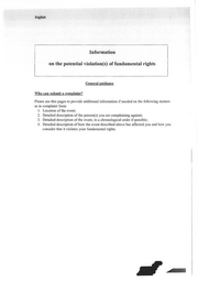 English Information on the potential violation(s) of fundamental rights General guidance Who can submit a complaint? Please use this pages to provide additional information if needed on the following matters as in complaint form: I. Location of the event; 2. Detailed description of the person(s) you are complaining against; 3. Detailed description of the event, in a chronological order if possible; 4. Detailed description of how the event described above has affected you and how you consider that it violates your fundamental rights.