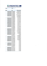 :::= FRONTEX • EUROPEAN BORDER AND COAST GUARD AGENCY Type CRO Date RO TOTAL PAID 15/01/2019 RO-00902 € 45,032.63 17/01/2019 RO-00887 € 138,427.83 22/01/2019 RO-00904 € 43,255.93 -- 24/01/2019 RO-00882 € 127,255.45 29/01/2019 RO-00885 € 38,686.88 RO-00905 € 45,330.91 05/02/2019 RO-00928 € 1,947.05 12/02/2019 RO-00929 € 1,947.05 19/02/2019 RO-00930 € 1,947.05 21/02/2019 RO-00883 € 2,439.60 26/02/2019 RO-00932 € 1,947.05 07/03/2019 RO-00954 € 1,872.15 12/03/2019 RO-00956 € 1,872.15 19/03/2019 RO-00955 € 1,872.15 26/03/2019 RO-00884 € 2,439.60 RO-00958 € 1,872.15 02/04/2019 RO-00975 € 2,019 .81 09/04/2019 RO-00976 € 2,019.81 16/04/2019 RO-00977 € 37,350.62 24/04/2019 RO-00978 € 1,848.96 30/04/2019 RO-01046 € 1,848.96 07/05/2019 RO-00947 €0.00 RO-01017 € 1,808.30 14/05/2019 RO-01018 € 1,808.30 21/05/2019 RO-01019 € 1,808.30 22/05/2019 RO-00966 € 2,439.60 28/05/2019 RO-01020 € 1,808.30 04/06/2019 RO-01009 € 0.00 RO-01069 € 0.00 12/06/2019 RO-01074 € 0.00 18/06/2019 RO-01070 €0.00 25/06/2019 RO-00949 € 0.00 RO-01071 €0.00 28/06/2019 RO-01072 €0.00 02/07/2019 RO-01102 €0.00 09/07/2019 RO-01103 €0.00 16/07/2019 RO-01104 €0.00