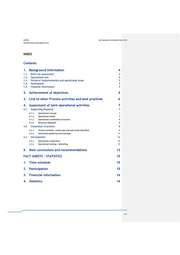 LIMITED Joint Operation Coordination Points 2014 FRONTEX EVALUATION REPORT 2014 INDEX Contents 1. Background information 4 1 .1 . Brief risk assessment 4 1.2. Operational aim 5 1.3. Period of implementation and operational areas 5 1.4. Participants 5 1.5 . Financial information 5 2. Achievement of objectives 6 3. Link to other Frontex activities and best practices 6 4. Assessment of joint operational activities 7 4.1 . Supporting Response 7 4. 1. 1. Operational concept 7 4.1 .2. Operational results 7 4.1.3. Operational coordination structures 8 4.1.4. Resources deployed 8 4.2. Situational Awareness 8 4.2.1 . Threat s and Risks, modus operandi and trends identified 8 4.2. 2. Information gathering and exchange 11 4.3. Development 12 4. 3. 1. Operational cooperation 12 4.3 .2. Operational briefing / debriefin g 13 5. Main conclusions and recommendations 13 FACT SHEETS - STATISTICS 15 1. Time schedule 15 2. Participation 15 3. Financial information 16 4. Statistics 16 2/ 21