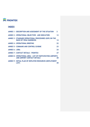 ........ :::::: FRONTEX INDEX ANNEX 1 - DESCRIPTION AND ASSESSMENT OF THE SITUATION 3 ANNEX 2 - OPERATIONAL OBJECTIVES AND INDICATORS 12 ANNEX 3 - STANDARD OPERATIONAL PROCEDURES (SOP) ON THE BASIS OF VEGA HANDBOOK 14 ANNEX 4 - OPERATIONAL BRIEFING 22 ANNEX 5 - COMMAND AND CONTROL SCHEME 23 ANNEX 6 - JORA 24 ANNEX 7 - CONTACT DETAILS - FRONTEX 27 ANNEX 8 - OPERATIONAL AREA - LIST OF PARTICIPATING AIRPORTS AND AIRPORT CONTACT DETAILS 28 ANNEX 9 - INITIAL PLAN OF DEPLOYED RESOURCES (DEPLOYMENT LIST) 30