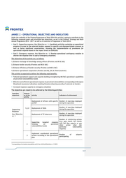 ~ FRONTEX ANNEX 2 - OPERATIONAL OBJECTIVES AND INDICATORS Under the umbrella of the Frontex Programme of Work 2014 this activity is going to contribute to the following corporate goals and prioritized key objectives, as set in the Frontex' Strategy and Multi Annual Prog ramme 2014 - 2017 as well as in concrete in Programme of Work 2014: ■ Goal 2: Supporting response, Key Objective nr. 1: Coordinate activities sustaining an operational presence in areas at the external borders exposed to specific and disproportionate pressure as well as facing significant uncertainties; including the implementation of procedures for operational response based on the impact levels on EUROSUR; ■ Goal 3: Emergency response, Key Objective nr . 1: Develop operational contingency modules to shorten the response time in case of emergency situations; The objectives of the activity are, as follows: 1. Enhance exchange of knowledge among officers (Frontex and MS & SAC) 2. Enhance border security (Frontex and MS & SAC) 3. Enhance efficiency of border security (Frontex and MS & SAC) 4. Enhance operational cooperation (Frontex and MS, SAC & Third Countries) This activity is expected to deliver the following main benefits: ■ Tailored operational support and capacity building strengthening MS/SAC operational capabilities at perceived vu lnerabilities/needs ■ Effective and efficient operational response at perceived vulnerabilities corresponding to European Situational Awareness indications (existing threats) enhancing security of external air borders ■ Increased response capaci ty to e mergency situations The objectives are meant to be achieved by the following activities: Goals/Key Objectiv objectives es of the Activity Indicators of achievement activity Deployme nt of officers wit h specific Number of man-days deployed profile' during the operation Number of ma n-days deployed 1,2,4 De ployme nt of SGOs Supporting during the operation Response Key Objective Number of man-days deployed Deployme nt of TC observers during the operation nr. 1 Number of reinforcing actions (e.g. gate check, doc checks Supporting targeted response with Ref Man experts or any 2 focusing on perceived other action what the vulnerabilities / needs particular vulnerability req ui res) Implement coordinated operational Number of airports 3 actions according to the operational participating plan 1 Corresponding to the tackled vulnerabiliti es and in line with the MB decision nr. 11 12012 . 12/ 27