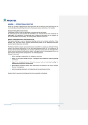 ~ FRONTEX ANNEX 4 - OPERATIONAL BRIEFING During the first days of deployment all participants from MS and observers from Third Countries will receive the Operational Briefing delivered by Frontex and national authorities of the host MS. General briefing delivered by Frontex The General briefing is a part of Operational briefing carried out by Frontex. All participants of the joint operation will be briefed by an Air Border Sector team member at the beginning of their deployment. In exceptional cases, if respective participants are not available for the centralized Operational briefing, the briefing will be delivered on the spot. National briefing delivered by host MS and host TC The National briefing is a part of Operational briefing carried out by national authorities of host Member State and Third Country (airport representatives) based on the deployment overviews provided by Joint Operations Unit (JOU). The National briefers (airport representatives) are responsible for carrying out National briefings, based on the Common Briefing Pack, for all participants deployed within JO. The content and the structure of the Common Briefing Pack are provided by Frontex Training Unit. The National briefers should deliver the National briefing at their airport to the guest officers, seconded guest officers and observers from Third Countries during the first day of the deployment National briefer shall: Deliver briefings as requested by the deployment overviews Report to the project manager (Frontex Training Unit) any irregularities regarding briefings carried out; Support the develo pme nt process of training courses, tools and materials, including the imple mentation process of such activities; Prepare Re port of Nationa l Briefer after each activity and submit it to t he proj ect manage r (Fro ntex Train ing Unit); Assist in prepa ring assessments and eva luations of the operation al activiti es. Standa rd plan for operational briefi ng and de briefi ng is availa ble in Ha ndboo k. 'll. / 27